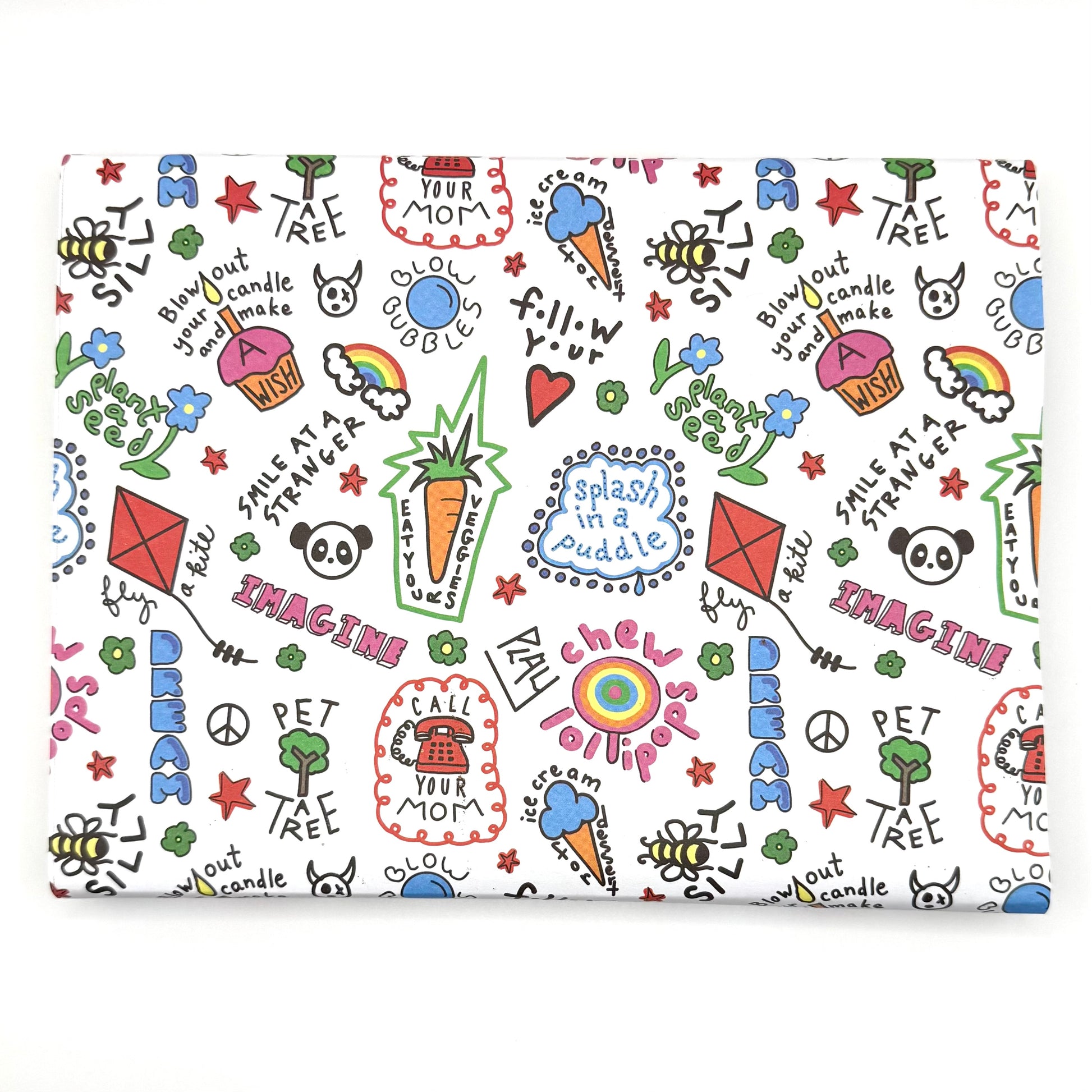 Joyful Chaos. Bright, bold, and full of energy—just like you. This isn’t just wrapping paper; it’s a reminder to embrace life’s little adventures. Chew lollipops. Call your mom. Hug a tree. Fly a kite. Eat your vegetables (yes, even the green ones). Splash in a puddle. Dream big. Imagine more. Blow bubbles for no reason at all.